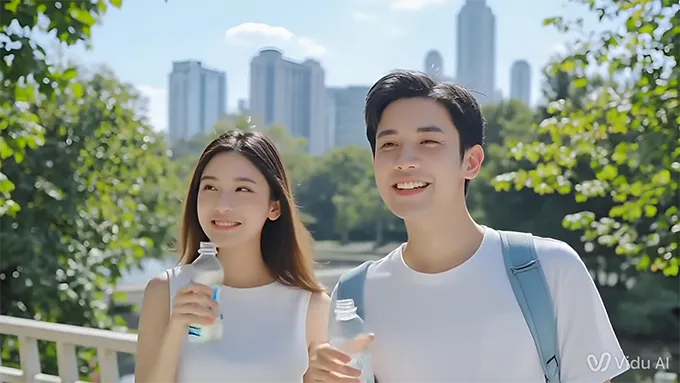 | 夏の昼下がり、都市部の公園や川沿いの屋外空間で、20代の日本人の男女が清涼飲料水を飲んでいる。 男女はバストアップで映し出され、清潔感のあるナチュラルな雰囲気。 透明でロゴのないボトルに入った飲料水を飲み、喉を潤しながら自然な笑顔でリフレッシュしている。 緑と空が広がる開放的な背景、強い日差しを感じる夏らしい空気感。 やわらかい自然光の中、自然な動きと表情のみで、演出は最小限。 清涼感と飲んだ瞬間の爽快さを視覚的に伝えるSNS向け動画。 |
