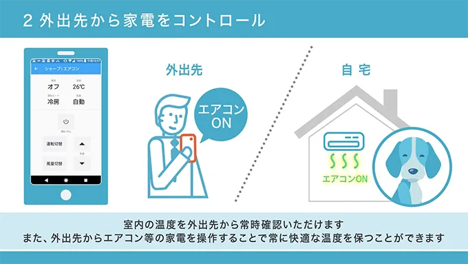 「子どもの見守り機能」「遠隔による家電操作」「自宅の見守り機能」をアニメーションで表現しました。近代的な商品の良さを簡潔にわかりやすく伝えたいときは、アニメーションが効果的です。